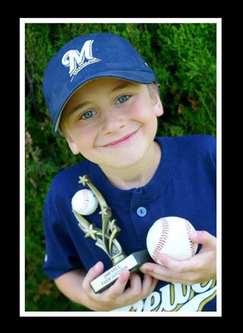 Well today was Austin's closing day with baseball. We had to get there pretty early so the sun was shining bright and HOT! It was very crowded too. The trophy part was pretty short and sweet but the announcments were almost an hour lol. Austin was very excited to get another trophy to add to the one he got last year. He also got a baseball from the coach, all the players did and if we were not camping next weekend then he would have gotten it signed by all the kids on his team, there will be a team party at the coaches house Sauturday. Austin was pretty bummed, but is excited about camping at the beach. Here are a couple pictures from the event.